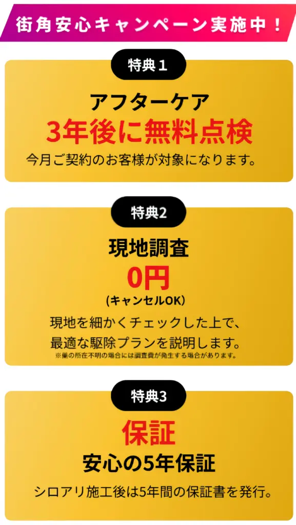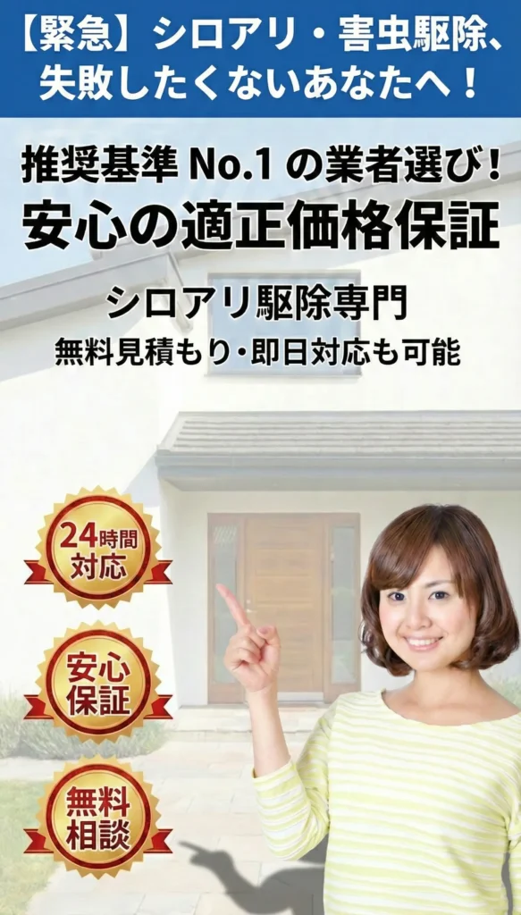 街角シロアリ駆除相談所は、「街角害虫駆除」が運営するシロアリ専門サービスです。単なる駆除にとどまらず、再発防止策まで徹底している点が高く評価されています。
